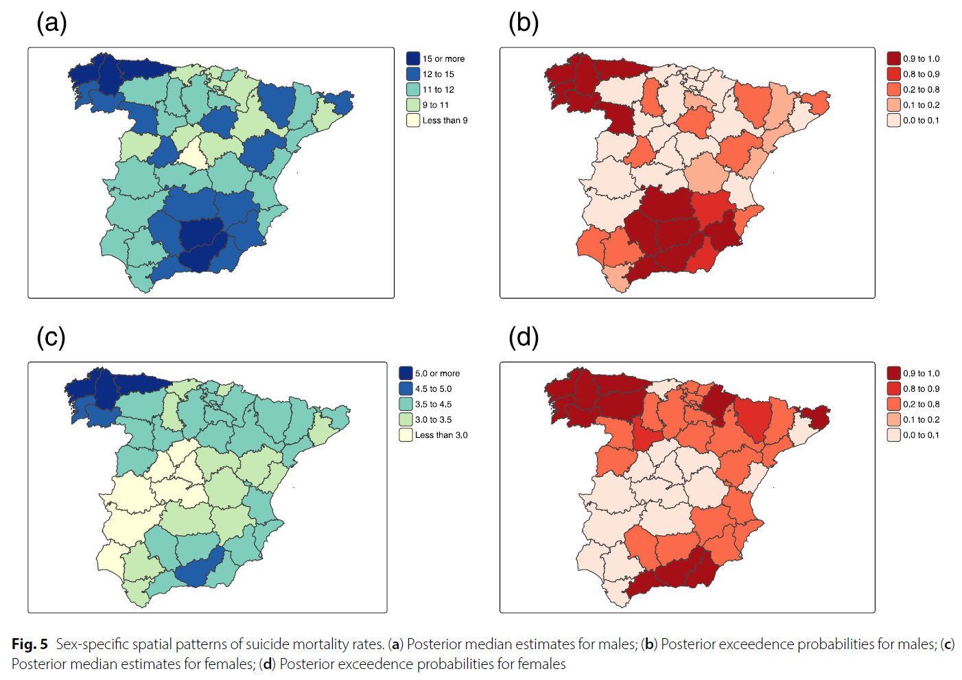 Background: Suicide remains a major public health concern worldwide, responsible for more than 700,000 deaths in 2021, accounting for approximately 1.1% of all global deaths. While many high-income countries have reported declines in age-standardized suicide rates over the past two decades, recent evidence from Spain indicates increasing mortality among women, whereas suicide rates among men have remained relatively stable. To better understand these patterns and their potential underlying determinants, this study examines the spatial and temporal patterns of age-stratified suicide mortality across Spanish provinces from 2010 to 2022, with particular attention to sex-specific differences. Methods: Mixed Poisson models were applied to analyze provincial- and temporal-level suicide mortality rates, stratified by age and sex. The models accounted for spatial and temporal confounding effects and examined associations with various socioeconomic and contextual factors, including rurality and unemployment. Results: Findings highlight the influence of rurality and unemployment on suicide mortality, with distinct gender-specific patterns. A 10% increase in the proportion of residents living in rural areas was associated with more than a 5% rise in male suicide mortality, while a 1% increase in the annual unemployment rate was linked to a 2.4% increase in female suicide mortality. Although male suicide rates remained consistently higher than female rates, a notable and steady upward trend was observed in female suicide mortality over the study period. Conclusions: The use of sophisticated statistical models permits the detection of underlying patterns, revealing both geographic and temporal disparities in suicide mortality across Spanish provinces.